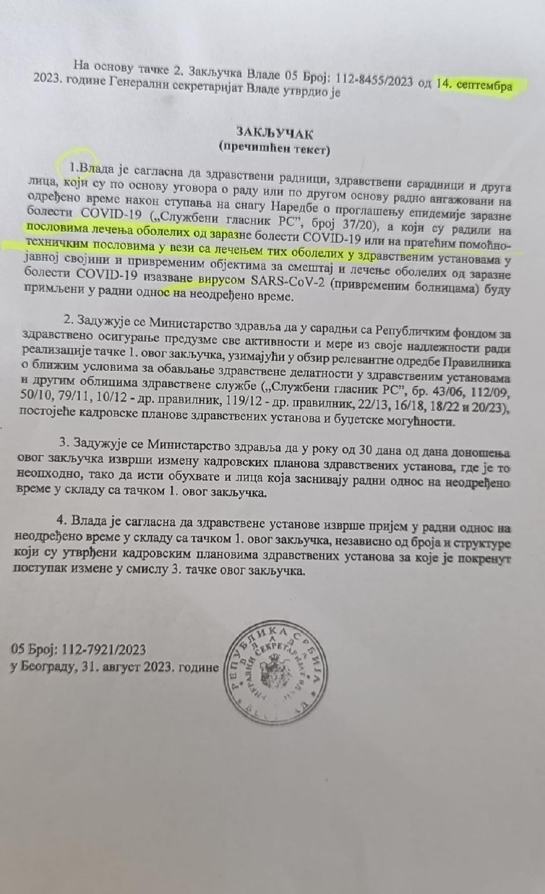 На основу Закључка Владе Републике Србије 05 број 112-8455/2023, од 14. септембра 2023.године, Генерални секретаријат Владе утврдио је пречишћен текст Закључка у вези са пријемом у радни однос на неодређено време лица која су радно ангажована у здравственим установама у јавној својини и привременим објектима за смештај и лечење оболелих од заразне болести КОВИД-19, након ступања на снагу Наредбе о проглашењу епидемије ове заразне болести.
